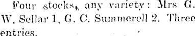 Gaillardias (collection not more than six stems): H and C. Meredith I, T. U. Wellington 2 and v.h.c., Miss Molly Mace h.c. Four entries. Three stocks, any variety: Mrs W.