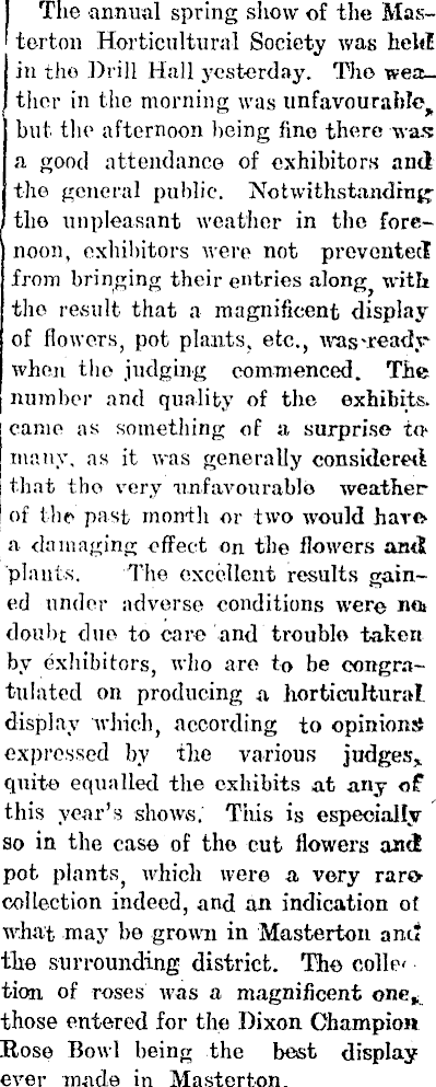 I The annual spring show of the Mas- ' terton Horticultural Society was heltl in the Drill Hall yesterday. The weather in the morning was but the afternoon being fine there was a good attendance of exhibitors and the general public. Notwithstandingthe unpleasant weather in the forenoon, exhibitors were not prevented from bringing their entries with the result that a magnificent display of flowers, pot plants, etc., wasvreadr when the judging commenced. The number and quality of the exhibits, came as something of a surprise to« many, as it was generally considered that the very unfavourable weather of the past month or two would havfr a damaging effect on the flowers ami "plants. The excellent results gained under adverse conditions were na doubt due to care and trouble taken by exhibitors, who are to be congratulated on producing a horticultural display which, according to opinions expressed by the various judges, quite equalled the exhibits at any of this year's shows. This is especially so in the case of the cut flowei's and pot plants, which were a, very rartv collection indeed, and an indication of what may be grown in Masterton anc< the surrounding district. The colic tion of roses was a magnificent one,, those entered for the Dixon Champion Rose Bowl being the best display ever made in Masterton.