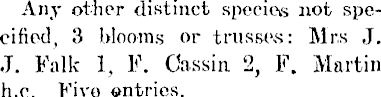 Any other distinct species not specified, 3 blooms or trusses: Mrs J. J. Fallc 1, F. Cassin 2, F. Martin h.c. Five entries.