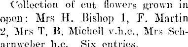 Collection of out flowers grown in open: Mrs H. Bishop 1, F. Martin 2, Mrs T. B. Michell v.h.c., Mrs Scharnweber li.e. Six entrie-s.