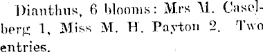 Dianthus, 6 blooms: Mrs M. Caselberg 1. Miss M. H. Payton 2. Two entries.