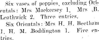 Six vases of poppies, excluding Orientals: Mrs Mackersey 1, Mrs ,B. Loathwick 2. Three entries. Six Orientals: Mrs H. H. Beetham 1, H. M. JBoddington 1. Five entries.