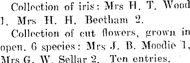 Collection of iris: Mrs H. T. Wood 1, Mrs H. H. Beetham 2. Collection of cut flowers, grown, in open. G species: Mrs J- B. Moodie 1, Mrs G. W. Sellar 2. Ten entries.
