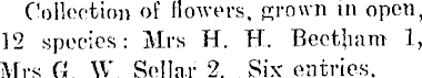 Collection of flowers, grown in open, 12 species: Mrs H. H. Beetham 1, Mrs G. W. Sellar 2. , Six' entries.