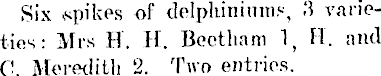 Six spikes of delphinium?, 3 varieties : Mrs H. H. Beetham 1, H. and C. Meredith 2. Two entries.