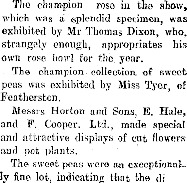 The champion roso in the show, | which was a splendid specimen, was exhibited by Mr Thomas Dixon, who, strangely enough, appropriates his own rose bowl for the year. The champion collection, of sweet; peas was exhibited by Miss Tyer, of Featherston. Messrs Horton and Sons, E. Hale, and F. Cooper. Ltd., made special and attractive displays of cut flowers and pot plants. The sweet peas were an exceptionally fine lot, indicating that the di