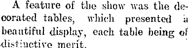 A feature of the show was the decorated tables, which presented ii beautiful display, each table being of distinctive merit.