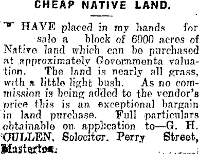 CHEAP NATIVE LAND. HAVE placed in my hands for sale a block of 6000 acres of Native land which can be purchased at approximately Govommenta valuation. The land is nearly all grass, with a little light bush. As no commission is being added to the vendor's price this is an. exceptional bargain in land purchase. Full particulars obtainable on application to —G. H. KJUIJJEN, Solocitor. Perry Street, __;