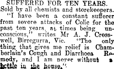 SUFFERED FOR TEN YEARS. Sold by all chemists arid storekeepers. "I have been a constant sufferer from severe attacks of Colic for the past ten years, at times being unconscious," writes Mr A. J. Cresswell, Birregurra, Vic. "The only that gives me relief is Chamberlain's Cough and Diarrhoea Rf*raedv, and lam never without ft kittle ia. J&g house."-