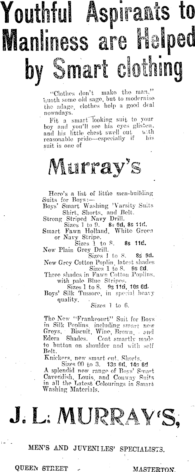 "Clothes don't make tlio man," quoth somo old sago, but to modernise* tho adage, clothos help a good deal nowadays. Fit a snuirtfTooking suit to your boy and you'll see his eyes glisten, and his little chest swell out V:th reasonable pride —especially if his suit is one of MB Hero's a list of lifct'io men-building Suits for Boys:— ' Boys' Smart Washing 'Varsity Suits Shirt, Shorts, and Belt. Strong Striped JSavy Drill. Sizes Ito 9. B.s 6d, 8S 11f!. Smart Fawn Holland, Whito Green or Navy Stripe. Sizes Ito R. 8s 11d. New Plain Grey Drill. Sizes .1 to 8. 8s 9d. New Grey Cotton Popliti. latest shades Sizes Ito 8. 9s Gti. Three shades in Fawn Cotton Poplins, with palo Blue Stripes. Sims Ito 8. 9s 11d. 10S Gd, Boys' Silk Tussore, in special heavy quality. Sizes 1 to 6. Tho New "Frankoourt" Suit for Boys in Silk Poplins including smart now Greys, Biscuit, Wine, Brown, . <itid Edera Shades. Coat smartly made to hntton on. shoulder and with self Belt. Knickers, new smart- out, Shorts. Sizes 00 to 3. 135 Bfs, 14s fid A splendid now range of Boys' Smart Cavendish, Louis, and Conway Suits in all the Latest Colourings in Smart Washing Materials. MEN'S AND JUVENILES' SPECIALISTS. QUEEJv STUEET - MASTERTON.