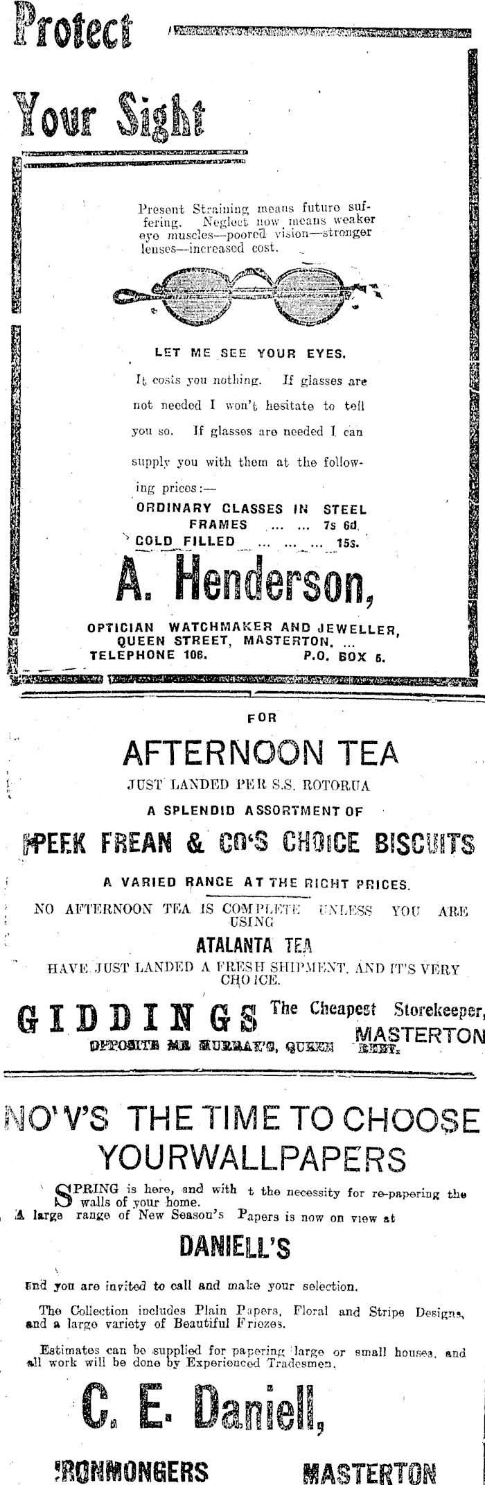 Protect ' Your Sight rm-wnpi mm u m ui l jq, yi iMfITOICTTffTiWftMi! JUffami Present Straining means future suffering. Neglect no\v_ means weaker eye muscles—poorccL vision—stronger leases —increased cost. Woe^gSSS LET ME SEE YOUR EYES. Ifc costs you nothing. If glasses are not needed I won't hesitate to tell you so. If glasses are needed 1. can supply you with tliem at the following prices:— ORDINARY CLASSES IN STEEL FRAMES 7s 6d, ' £54L F . ,LLED •• 15s - A. Henderson, OPTICIAN WATCHMAKER AND JEWELLER QUEEN STREET, MASTERTON. ... ' TELEPHONE 106, P.O. BOX B. FOR AFTERNOON TEA JUST LANDED PER S.S. ROTORUA A SPLENDID ASSORTMENT OF JfEF.K FREAN & GO'S CHOICE BISCUITS A VARIED AT THE RICHT PRICES. NO AFTERNOON" TEA IS COMPLETE UNLESS YOU ARE USING ATALANTA TEA HAVE JUST LANDED A FRESH SHIPMENT. AND IT'S VERY ICE. GIDDIN GS The Cheap SU s ;7'X' OKOSITB MB WOT, MOWS THE TIME TO CHOOSE YOURWALLPAPERS SPRING is here, and with t the necessity for r&-paperin K the wails of your home. ;i large range of New Season's Papers is now on view at DANIELL'S end yon are invited to call and make your selection. The Collection includes Plain Papers, Floral and Stripe Designs, and a large variety of Beautiful Frieze 3. Estimates can be supplied for papering ; large or small houses. and all work will be done by Experienced Tradesmen. C. E- Daniel!, IRONMONGERS MASTERTON