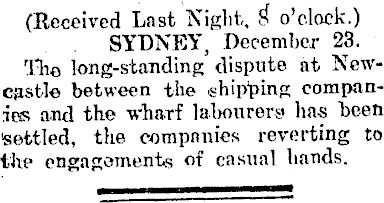 (Received Last Night, £ o'clock.) SYDNEY, December 23. The long-standing dispute at Newcastle between the shipping companies and the wharf labourers has been Settled, the companies reverting to the engagements of casual hands. M^—ia——■——I