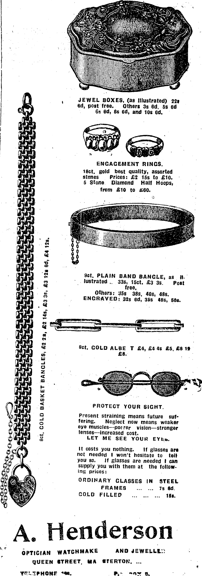 atf* T>* STC *# C^V *S" \Si #<?♦' JEWEL BOXES, (as Illustrated) 221 6rt, post free, others 3s 6d. 5s 6d 6s 6d, 8s 6d, and 10s ed. *M ENGAGEMENT RINGS. IBct. gold best quality, assorted stones Prices: £2 15s to £lO. 5 Stone Diamond Half Hoops, from £lO to £6O. »■:■". -4 t\m wSmaKKKKIIIKwIK 9et. PLAIN BAND BANGLE, as Illustrated .. 335, 150t. £3 3S. Polt free. Others: 35s 38s, 40s, 48s. ENGRAVED: 32s Bd, 35S 48s, 50s. Set. GOLD ALBE T £4, £4 4s £5, £8 1# £B. gmmmm w~t PROTECT YOUR SIGHT. Present straining means future suffering. Neglect now means weaker eye muscles—poc rer vision—stronger lenses —increased cost. LET ME SEE YOUR EYfc*. It costs you nothing. If glasses arc not needed I won't hesitate to tell you so. if glasses are needed I can supply you with them at the following prices: ORDINARY CLASSES IN STEEL FRAMES 78 Bd. COLD FILLED 15*. I OPTICIAN WATCHMAKE AND JEWELLS QUEEN STREET, HA fffERTON. ... VtiLSPMOttf! «*». *i- '"«!? ft.
