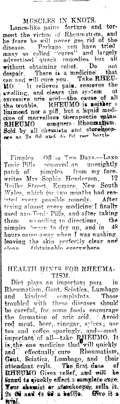 MUSCLES IN KNOTS. Lance-like pair:« torture and torment, the victim of Rheumatism, and he foara h<? will nover pet rid of the disease. Perhaps you have tried many so'called "cures" and largely advertised' quack remedies bnt aVI without obtaining relief. Bo not despair. There u a medicine 1 that can and will cure you. Take RBEUMO. It relieves paia, removes the nwoiling. and clears the system ot oxcessive nro acid—the cause of all the trouble. KHETJMO i« »ei*k«r ■ » liniment nor a piM, but a liquid medicine of marvellous tiierapentie RHEUMO «mqiM*«" Rbennia#BHi. Sold by all chei»i*tai ami. storefeeepor« at 2* fid XUti As fV| wf Wtlf. Firnplos .OJT'in Two Days.—Laxo Tonic Pills removed no nnesightly patch of pimples from my face. writes Mrs Sophia Henderson, 12 Street. Enmore. New South : Wales, which for two months had res- ! i«+f>d every possible remedy. After trying almost every medicine'l finally used axo-Tonir Pill's, and after taking them according to directions, the pimples berr-'in to dry up, and in 4$ hours oame away when T was washing, leaving the skin perfectly clear and rlon.n ( ihtainabl" ivervwhere. HEALTH HTXTS TOR RHEUMA- ' TTSM. . Diet plays nn important part in Rheumatism,.Oont. Sciatica, Lumbago and kindred ef-m plaints. Those troubled with these diseases should bo. careful,.for, some foods encourage the formation of uric acid. ' Avoid ret] meat, hear,..vine-gar, sj-'ces; use tea and coffee, sparinglv. and—-most important' of all—takeßHlftTMO. It I is r tlie oho medicine that will quickly and." effectually' cure Rheumatism^ I Griut, Sciatica, Lumbago, and their i attendant evils. TW .first dose of SflfßlJlffO Gives relief. and; will he tfoxmxl t» qiuofely effect a< •amjjlete ettpfc ¥«w *ktt«ist «r aoHa it. 2s 01 a** 4$ W a k«ff «. Qfcre it a l *ri*J.