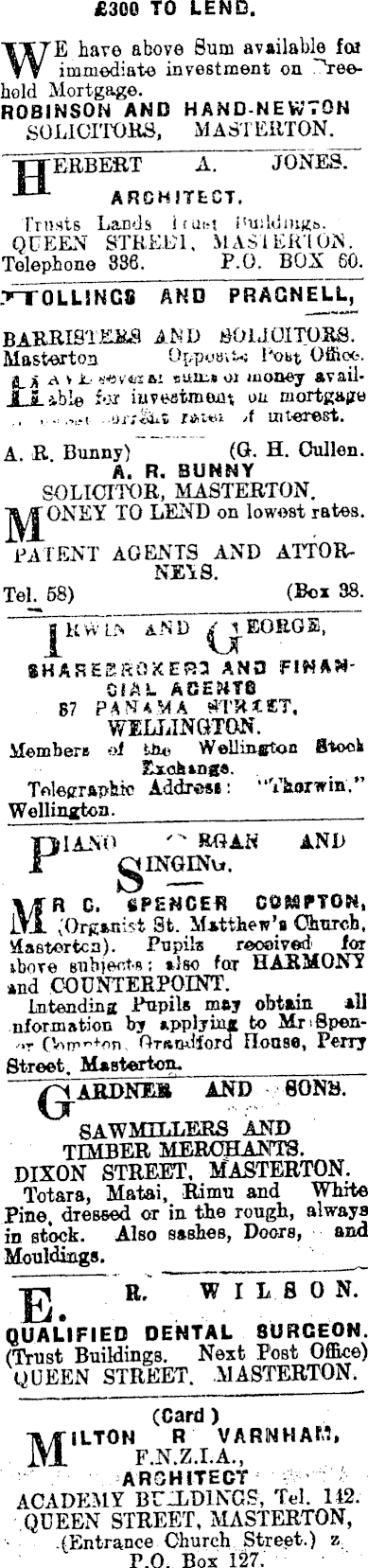 £3OO TO LEND. E have above Sum available foa immediate investment oil ~Veehold Mortgage. ROBINSON AND HAND-NEWTON SOLICITORS, MASTERTON. TTTERBERT A. JONEBT ■*-*- ARCHITECT. Trusts Lands iruiM QUEEN STRE.EI. MASIER'ION. Telephone 836. P.O. BOX 60. TTQLLiNCS AND PRAGNELL^ BARRIS'ima AND tfOIJUITUBS. Mastertoa Pobt Office-, aa a v ««v4iSii sitiii# \>x money availJLiLibl© f»jr iuveatroeuat an mortgage , , n&iX&i A interest. A. R Bunny) (G. H. Oullen. A. R. BUNNY SOLICITOR, MASTERTON. ONEY TO LEND on lowest rates. PATENT AGENTS AND ATTORwipt a Tel. 58) * ' (Boi 38. KVv L* aN D EQItGS, BHARESftOKEAND FINANCIAL ACEHTB 87 pANT AMA STKtET, WELLINGTON. Members oi the Wellinfiton Stock Excising®. Telegraphic Addresi: "Ykorwin." Wellington. PIANO RfIAN AND gINGINu. MR C. SPENCEfI COMPTON, v'OrfiMiist St. M*tthev'a Church, iiastertcn). Pupils received 1 for ibove subjects; tiso for HARMONS and COUNTERPOINT. Lntendina Pupils mtj obtain. *ll nformation by applying to Mj.Spen"r OT&ndford House, Perry Street. Maflterton. O_AJtDNE» AND SONS. SAWMILLESS AND TIMBER MERCHANTS. DIXON STREET, MASTERTON. Totara, Matai, Rimu and White Pine, dressed or in the rough, always in stock. Also s*Bhes, Doors, and Mouldings. _ jjj R, WILB ON. QUALIFIED DENTAL SURGEON. (Trust Buildings. Next Post Office) QUEEN STREET, MASTERTON, (Card ) ILTON R VARNHAM, F.N.Z.1.A., ARGHITEC? - ACADEMY BUILDINGS, Tel. 142. QUEEN STREET, MASTERTON, .{Entrance Church Street.) z P.O. Box 127. M 1