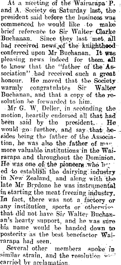 At a meeting of the Waimrapa'P. . and A. Society on Saturday last, the president said before the business was commenced he would like to make brief reference to Sir Walter' oarke Buchanan. Since they last met. all had received knighthoodconferred upon Mi- Buchanan. It was pleasing news indeed for them. «H to know that the "father of the Aesociation" . had received such a great honour. He moved that the Society warmly congratulates Sir Walter Buchanan, and that a copy of the resolution be forwarded to him. Mr G. W. Deller, in seconding the . motion, heartily endorsed all that had been said by the president.. . He would go: further-, and say ; that -he- .- sides being the father, of the Association, he was also the father of mm* more valuable institutions in the Wairarapa. and throughout the Dominion. He was one oilthe pioneens who V,ed -to establish the dairying. industry in New" Zealand, and along with the late Mr Brydone he was instrumental . in starting the meat freezing industry. Tin fact, there was not a Victory or any institution, sports or othenri<?" that did not have Sir Walter Buchanan's hearty support, and he was sure Ills name would he handed down to posterity as the best benefactor Wairarapa had seen. Several other members .spoke m similar strain, and the resolution carried, by acclamation.