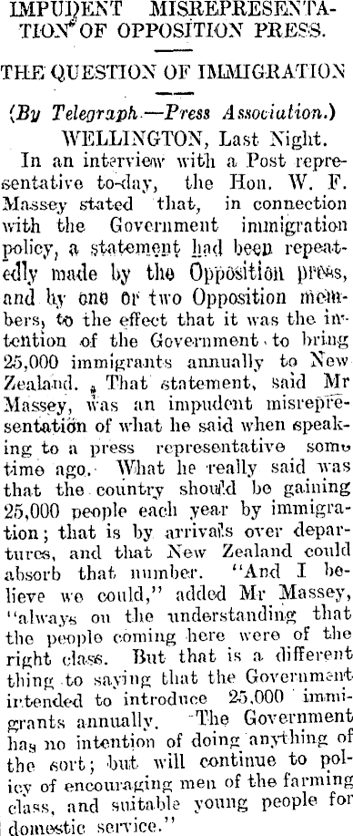 IMPUDENT MISREPRESENTATION OF OPPOSITION PRESS. THE QUESTION OF IMMIGRATION {By Telegraph,—Press Association.) WELLINGTON, Last Night. In an interview with a Post representative to-day, the Hon. W. F. Massey stated that, in connection with the Government immigration policy, a statement hacj been repeatedly made by tlio Opposition and by ono Or two Opposition rtietobersj to the effect that it was the in- j tclltion of the Government. to bring | 25,000 immigrants annually to New Zealand. 4 That statement, said Mr Massey, was an impudent misrepresentation of what he said when speaking to a press representative som« time ago.- What he really said was that the country should he gaining 25,000 people each year by immigration ; that is by arrivails over departures, and tliat New Zealand could absorb that number. "And I believe we could," added Mr Massey, "always on the understanding that the pet)pio coming here were of the right class. But that is a different thing to saying that the Government ir.tended to introduce 2-y,OOO immigrants annually. The Government hag no intention of doing anything of the sort; but will continue to policy of encouraging men of the farming class, and suitable young people for domestic service."