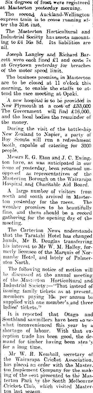 Six degrees of frost were registered a,t Masterton yoste/tlay morning. Tho second, Auckland-Wellington express train is to cea-%© Tunning after tho 31st iast. The Maetei-ton Horticultural and Industrial Society has assets amounting to £4 16s 8d; Its liabilities are nil. Joseph Langley and Richard Barrett were -each fined £1 and costs 7s at Greytown yesterday for breaches of the, motor speed limit. The business premises in Moste-rton are to be closed at 11 o'clock this morning, to enable the staffs to attend the race meeting at Opaki. A now hospital is to be provided in New Plymouth'at a cost '■'•of £33,000 The Government will find £16,000. «i.nd the local bodies tho remainder of tho money. During the visit cf the battleship j New Zealand to j\ r a<pier, a party of ! Boy Scouts will rtin a refreshment booth, capable of catering lor 3000 people. Messrs E. G. Eton and J. C. Ewington have, as was anticipated in our issue of yesterday, been returned un6pjx>.<ed as representatives of the Masterton Borough on the Wairarapa Hospital.and Charitable Aid Board. A large number of visitors from north and south arrived in Masterton yesterday for tho raoes. The weather promises to bo beautifully fine, and there should be a record gathering for the opening day of the mooting. Tho Carterton Now* understands that the Taratahi Hotel has changed hands, Mr B. Douglas transferring his interest to Mr W. M. Bailey, formerly licensee of the Marquis of Norman by Hotel, and lately of Palmerston North. The following notice, of motion will be discussed at the annual meeting of the Masterton Horticultural and Industrial Society .—"That instead of issuing family tickets a,s at present, members paying 10h per annum be supplied with one three ladies' tickets." It is reported that Ot-ago and Southland sawmillers have been feonewhat inconvenienced -fthis year by a shortage of labour. With that exception trade has been good, the demand for timber having been stea'y for a long time.. Mr W. JR. Kern ball, secretary of the Wairarapa Criefcet Association, has placed an order with the Masterton, Implement Company for tbe. making of the (-eat presented to the Masterton Park by the South Melbourne ■Cricket. Club, which visited Masterton last season.