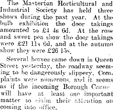 The Masterton Horticultural and Industrial Society has held three shows during the past year. At the bulb .exhibition the door takings amounted to £'4 4s 6d. At the ros« and sweet pea show the door takings were £2l lis Od, and at the autumn show they were £26 15s. iSevera! horses came down in Queen Street yesterday, the roadway seeming to be dangerously slippery. Complaints were numerous, and it seems as if tlie incoming Borough Coum-' will have at least one important matter to <:):iim their .lUoution on coming into office.