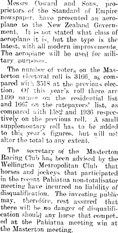 Messrs Ctoward and Sons, proprietors of the Standard of Empire newspaper, have presented an aeroplane to the New Zealand Government. Ft its iiot stated what class of aeroplane it is. hut the type is the latest, with-all modern improvements. The aeroplane will be'used for mili-tary.,-ipurjx>s?i-. The nnniJwr of voter s on the Masterton electoral roll is 3106. a s compared w'itii 3-518 at the. .previous election. Of xhis year's, roll there arc 1499 na:iie.p on the residential list and 1667 on the ratepayers' list, as ■compared v.ith IoS2 and 1936 respectively on the previous roll. A small supplementary roll has to be added to thi s year's figures, but will not alter the total to any extent. The swrretary of the Masterton Racing C'Jub hag. been advised by the Wellington Metropolitan Club ' that horses and jockeys that participated in the recent Pahiatua non-totaiisator meeting'have incurred no liability of disqualification. The investing public may, therefore, rest assured' that there will be no danger of disqualification should any horse that competed at the Pahiatua meeting win at the Masterton meeting.
