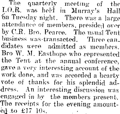 The quarterly meeting of the 1.0. R. was held in Murray's Hall en Tuesday night. There was a large attendance of members, presided over by C.R, Bro. Pearee. The usuail Tent business was-transacted. Three can. didates were admitted as members. Bro W. M. East-hope who represented the Tent at the annual conference, gave a very interesting account of the work done, and was accorded a hearty vote of thanks for his splendid address. An interesting discussion was engaged in by the members present. The receipts for the evening amounted .to £l7 10s.