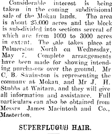 Considerable interest is being ta.keiu in the coming; subdivisional sale of tli" Mokau lands. The area is about 25.000 acres and the blockis snlj-dividcd into sections several of which are from 1000 to 3000 acres in extent. The s aJe takes place at Palmers!, on Xorth on Wednesday, May 7. Complete arrangements have been made for showing intending purchaser* over the ground. Mr C. B. Swainston is i-epre.sen.ting the com pan v at Mokan. and Mr J. H. Stmbbs at Waitara, and they Avill give all information and assistance. Full particulars can also be obtained from Messrs James Macintosh and Co., Ma&terton. SUPERFLUOUS HAIR.