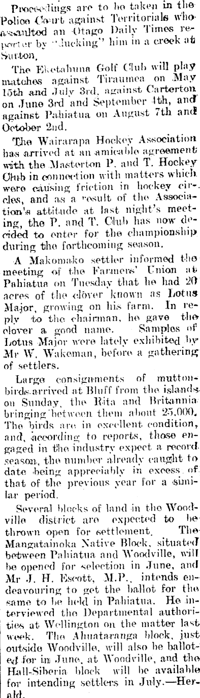 Prom-lings are to ho taken in the Police Out against Territorials Whoassaulted an Otago Daily Times re-pm-ter by -'.lucking'' him in a creek afs Sutton, The Eketalmna Golf Club will play matches against Tiraumea on .May loth and July 3rd. against Carterton on June 3rd and September 4th, and against Pahiatua on August 7th and October 2nd. The Wairarapa Hookey Association ha-s arrived at an .amicable agreement; with the .Mnsterton P. and T. Hockey Ohi-b in connection with matters which, were causing'friction in hockey cir-. cles, and n.s a '-esult of the Association,'a attitude at last night's meeting, the P. and T. Club lias now derided to enter for the championship, during the forthcoming sea-son. A Makomako settler informed the meeting of the Fanner**' Union at Pahiatua on Tuesday that he had 20 acres of the clover known as Lotus Major, growing on hi.s farm. In reply to the chairman, he gave theclover a good name. Samples of Lotus Major wore lately exhibited by .Mr W, Wakeman, before a gathering; of settlers. Large consignments of muttonbirdfc.nrrived at Bluff from the islandson Sunday, the liita and Britannia, bringing'between them about 2o.00(L The birds arc. in excellent condition, and, according to reports, those engaged in t)he industry expect a record .season, the number already caught to date, .being appreciably in excess, of that of the previous year for a similar period. Several blocks of land in the Woodvillo district are expected to lie thrown open for settlement. TheMangatainoka Native Block, situated between Pahiatua and Woodville, willbe opened for selection in June, and Mr J. H. Eseott, M.P.. intends endeavouring to get the ballot for the same to be held in Pahiatua, He interviewed the Departmental authorities at Wellington on the matter last wwk. The .Aliuataranga block, just outside Woodville, will also be ballot-" e<| for tni June, at Woodville, and the Hall-Siberia block will be available for intending settlers in July.—Herald.