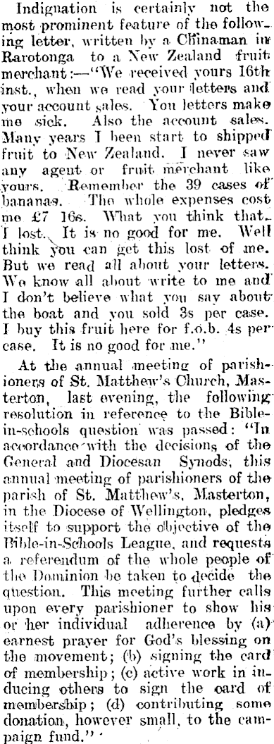 Indignation is certainly not the most prominent feature of the following letter, written l>y a Cltinaman iiif Rarotonga to a New Zealand fruiti merchant: —"We received yours 16th: in>st., when wo read your letters and your account sales. You letters make me sick. Also the account sale*. Many years I lieen start to shipped fruit to New Zealand. I never saw any agent or fruit merchant like yours. Remember the 39 cases of" bananas. The. whole expenses cost. me £7 16fi. What you think that-' 1 lost. It is no good for me. Well think you can get this lost of me. But we read all about your letter*. Wo know all about write to me and I don't believe what you say aboutr the boat and you sold 3s per case. I buy this fruit here for f.o.b. 4s per case. It is no good for me." At the annual meeting of parishioners of St. Matthew's Church, Masterton, last evening, the following-" resolution in reference to the Bible-in-sehools question was passed: "In. accordance'with the decisions of the General and Diocesan Synods; this annual meeting of parishioners of the parish of St. Matthew's, Masterton, in the Diocese of Wellington, pledges itself to support the objective of the Bible-in-Schools League, and requests a referendum of the whole people of" the Dominion bo taken to decide the question. This meeting further calls upon every parishioner to show his or her individual adherence by (a)' earnest prayer for God's blessing on the movement; (b) .signing the card! of membership; (c) active work in inducing ©thena to sign the card ofmemibe.r&'hip; (d) contributing some * donation), however small, to the campaign fund." '