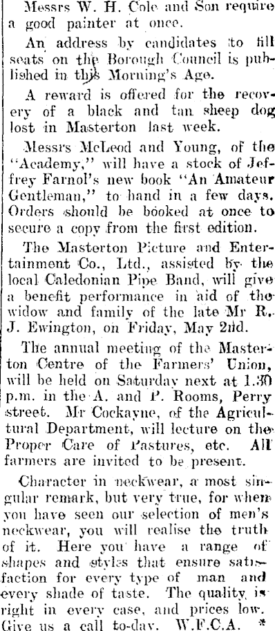 Messrs W. H. Cole and Son require a good painter at once. An address by candidates .'to till seats on the Borough Council is published in thjs Morning's Age. A reward is offered for the recovery of a black and tan sheep dog lost in Masterton last week. Messrs MeLeod and Young, of the "Academy," will have a stock of Jeffrey Farnol's new book "An Amateur Gentleman," to hand in a few days. Orders >shonld be booked at once to secure a copy from the first edition. The Masterton Picture and Entertainment Co., Ltd., assisted by- tlie local Caledonian Pipe Band, will give a benefit performance in aid of thor widow and family of the late Mr R.J. Ewington, on Friday, May 2ild. The annual meeting of the. Masterton Centre of the Farmer;;' Union, will be held on Saturday next at I.MO p.m. in the A. and P. Rooms, Perry ■street. Mr Cockayne, of the Agricultural Department, will lecture on theProper Care of Pastures, etc. All farmers are invited to be.present-. Character in neckwear, a most singular remark, but very true, for when? you have seen our selection of men's neckwear, you will realise the truth of it. Here you have a range of .shapes and stylc-s that ensure satisfaction for every type of man and every shade of taste. The quality, is right in every case, and prices low. Give us a call to-day. W.F.C.A. *