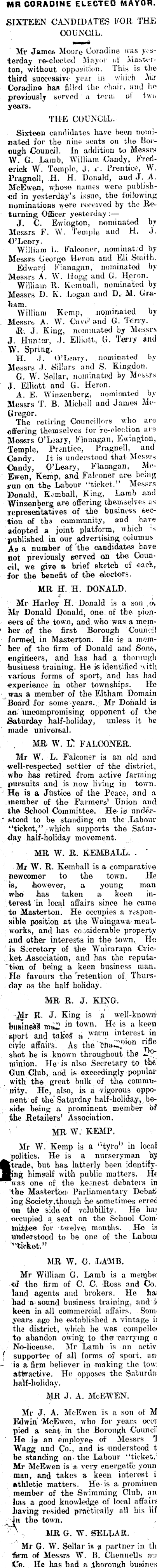 MR CORADINE ELECTED MAYOR. SIXTEEN CANDIDATES FOR THE COUNCIL. Mr Jame6 Moore Cora-dine was yesterday re-elected Mayor of Masterton, without opposition. This is the third successive year in which Mir Coradine has filled the chair, and ho previously sorved a term of two years. THE COUNCIL. Sixteen candidates have been nominated for the nine aeats on the Borough Council. In addition to Messrs W. G. Lamb, William Candy, Frederick W. Temple, J. jr. Prentice, W. Pragnell, H. H. Donald, and J. A. McEwen, whose names were publish«'d in yesterday's issue, the following nominations were received by the Re- - turning Officer yesterday : J. C. Ewiington, nominated by Messrs F. W. Temple and H. J. O'Leary. William L. Falconer, nominated by Messrs ■George Heron and EH Smith. Edward Flanagan, nominated byMessrs A. W. Hogg and G. Heron. William. It. Kemball, nominated by Messrs D. K. Logan and D. M. Graham. William Kemp, nominated by . Messns A. W. Cave' and G. Tony. ft. J. King, nominated by Messrs J. Hunter, J. Elliott, G. Terry and W. Spring. H. J. O'Leary, nominated by Messrs J. Sillars arid S. Kingdon. G. W. Sellar, nominated by Messrs J. Elliott and G. Heron. A. E. Winaenberg, nominated by Messrs T. B. Miohell and James McGregor. The retiring Councillors who are offering themselves for re-election are Messrs O'Lsary, Flanagan, Ewington, Temple, Prentice, Pragnell, and Candy. It- is understood that Messrs Candy, O'Leary, Flanagan, Me- ■ Ewen, Kemp, and Falconer are being run on th e Labour "ticket." Messrs Donald, Kemball, King, Lamb and Winzenberg are offering themselves as representatives of tho business section of tha community, and have adopted a joint platform, which <-s published in our advertising, ooluinus As a number of 'the candidates have not previously served <xa the Council, we give a brief sketch of each, for the benefit of the electors. MR H. H. DONALD. : Mr Harley H. Donald is a son .6, Mr Donald D,onald, one. of the pioneers of the tow,m, and who was a mem- ' ber of the first Borough 'Council formed, in Masterton. He ie a member of the firm of Donald and Sons, engineers, and has had a thorough business training. He is identified with various forms of sport, and has had experience in other townships. He •was a member of the Eltham Domain Board for some-years.. Mr Donald is am. imeompromising opponent of the . Saturday half-holiday, unless it be made universal. . MR W. FALCONER. Mr W. L. Falconer is an old and well-respected settler of the district, who has retired from active farming ... pursuits and is now living in town. ' He is a Justice of the Peace, and a member of the Farmers' Union and the School Committee. He ie under- .." stood to be standing on the .Labour "ticket,".-which supports the Saturday half-holiday movement. MR W. R. KEMBALL. . ' Mi- W. R. Kern-ball is a comparative newcomer to the town. He is, however, a young man who has taken a keen interest in local affairs since he came to Masterton. He occupies a responsible position at the Waingawa meatworks, and has considerable property and other interests in the town. He is Secretary of the Wairarapa Cricket Association, and has the reputa- - "tien of being a keen business man. He favours the "retention of Thursday as the half holiday. MR R. J. KING. Mr R. J, King is a well-known-bti»ine*3 im£ in town - H < » » kke n sport and takes* a wa ™ interest in civic affairs. As the' , tm^ ,lon " fle shot he is known throughout the <~?~ minion. He is also Secretary to the Gun Crub, and i*> exceedingly popular with the great bulk of the community. He, also, is a vigorous opponent of the' Saturday half-holiday, beside heing a prominent member of the Retailers' Association. MR W. KEMP. Mr W. Kemp is a ''tyro*' in local politics. He is a nurseryman by dfctrade, but has latterly been identifyBnng himself with public matters. He was one of the keenest debaters in the Mastertbriii Parliamentary Debating Society,though he sometimes erred «n the side of volubility. He has occupied a seat on the School Colnmiiijtee for twelvei months. He is understood to be one of the Labour "ticket." MB W. G. LAMB. Mr William G. Lamb is a member «f the firm of C. C. Ross and Co.. land agents and brokers. He haif had a- sound business training, and if keen in. a.ll commercial affairs. Som< years ago he established a vintage i' the district, which he was compellec to abandon owing to the carrying a No-license. Mr Lamb is an activ< f supporter of all forms of sport, anc -. is a firm believer in making the towi attractive. He opposes the Saturday half-holiday. MR J. A. McEWEN. Mr J. A. McEwen is a son of M Edwin' McEwen, who for years oeeu pied a seat in the Borough Council He 19 an employee of Messrs T Wagg and Co., and is understood t be standing on-the Labour "ticket.' Mr McEwen is a very energetic younj man, and takes a- keen interest ii athletic matters. He- is a prominen member of the Swimming Club, am has a good knowledge of local affairs having resided practically als his lif' the town. MR G. W. SELLAR. Mr G. W. Sellar is a partner in th< ■firm of Messirs W. B. Chennells amx CSo. He has had a thorough busrines<