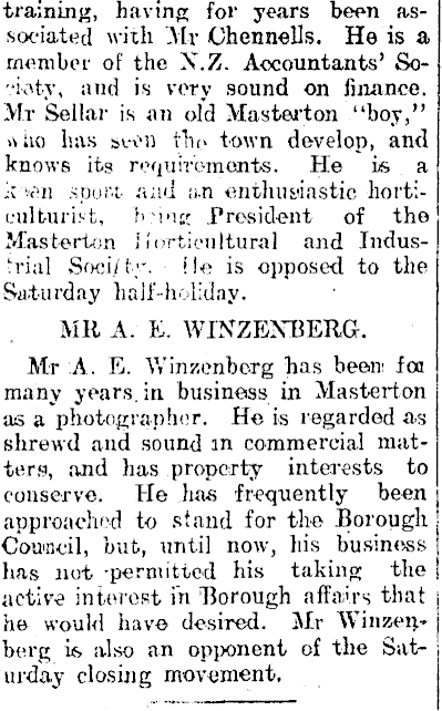 training, having for years been associated with Mr Chennells. He is a member of the N.Z. Accountants' So"wty, and is very sound on finance. Mr Sellar is an old Masterton "boy," >\iio has sex*n the town develop, and knows its requirements. He is a k vt>n spoiu- and an enthusiastic horticulturist, ii;i'ig President of the Masterton Horticultural and Industrial Socif!,''. Me is opposed to the Saturday half-holiday. MR A. E. WINZENBERG. Mr A. E. Winzenberg has been; foa many years, in business in Masterton as a photographer. He is regarded as shrewd and sound an commercial matters, and has property interests to conserve. He has frequently been approached to stand for the Borough Council, but, until now, his business has not -permitted his taking the active interest in Borough affairs that i he would have desired. Mr Winzenberg is also an opponent of the Sat- i tirday closing movement.
