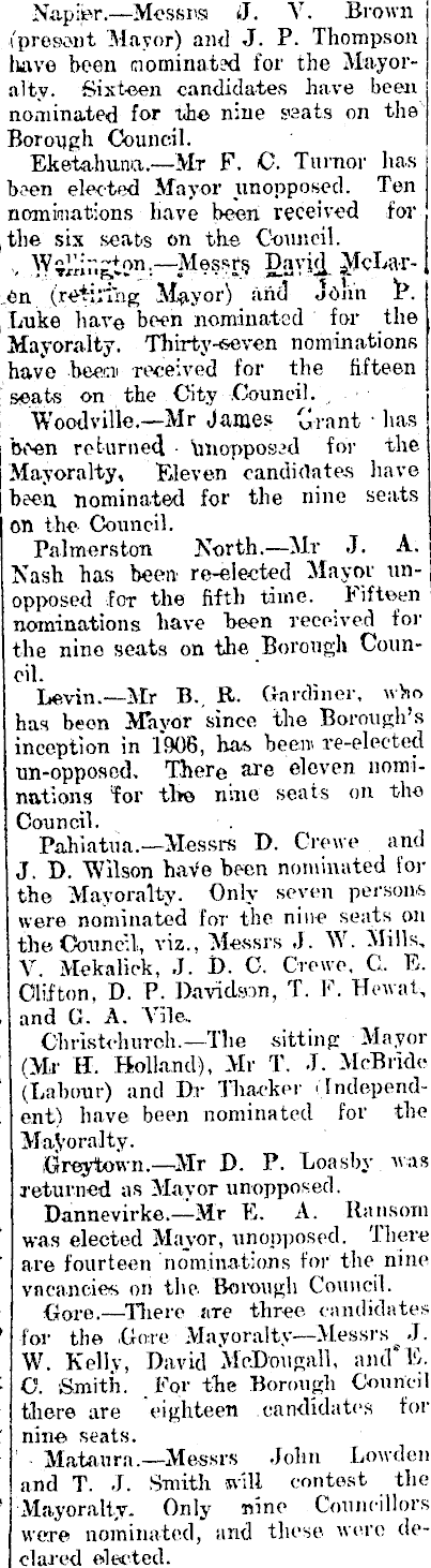 Napier.—-Messrs) J. V. Brown (present Mayor) and J. P. Thompson liave been nominated for the Mayoralty. Sixteen candidates have been nominated for the nine seats on the Borough Council. Eketahuna.—Mr F. C. Tumor has boen elected Mayor unopposed. Ten nominations have been received for six seats on the Council. -. W?«ir l g,tt? n v —Messrs McLaren (rehiring Mayor) and John P. Luke have been nominated for the Mayoralty. Tliirtynseven nominations have beer.ii received for the fifteen seats on the City Council. , Woodville.—Mr James Grant • has been returned • unopposed for the Mayoralty, Eleven candidates have been, nominated for the nine seats on the Council. Palmerston North. —Mr J. A. Nash has been re-elected Mayor unopposed for the fifth time. Fifteen nominations have been received for the nine seats on the Borough Council. Levin.—Mr 8., R. Gardiner, w>io has been Mayor since the Borough's inception in 1906, has beem re-elected un-opposed. There are eleven nominations for the nine seats on the Council. Pahiatua.—Messrs D. Crewe and J. D. Wilson have been nominated for { the Mayoralty. Only seven persons were nominated for the nine seats on 1 the Council, viz., Messrs J. W. Mills, ■ V. Mekalick, J. D. C. Crewe, G. E. | Clifton, D. P. Davidson, T. F. Howat, P and G. A. Vile, Christehuroh.— The sitting Mayor { (Ma- H. Holland), Mr T. J. Mcßride , (Labour) and Dr Thacker (Independent) have been nominated for the Mayoralty. Greytown.—Mr D. P. Loasby was returned as Mayor unopposed. Dannevirke.—Mr E. A. Ransom f was elected Mayor, unopposed. There * are fourteen nominations for' the nine * vacancies on the Borough Council. Gore.—There are three candidates y for the Gore Mayoralty—Messrs J. W. Kellv, David McDougall, and 15. ' O. Smith. For the Borough Council 1 there are eighteen candidates for nine seats. 1 ' Mataura.—Messrs John Lowden ' and T. J. Smith will contest the * Mayoralty. Only nine Councillors wcro nominated, and these were declared elected.