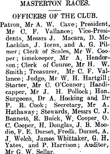 MASTERTON RACES. OFFICERS OF THE CLUB. Patron, Mr A. W. Cave; President, Mr 0. F. Vallance; Vice-Presi-dents, Messrs J. Macara, D. McLachlan, J. lorns, and A. 6. Pilmer; Clerk of Scales, Mr W. Coo» per; timekeeper, Mr A. Henderson ; Clerk of Course, Mr H. W. Smith; Treasurer, Mr C. F. Vallance; Judge, Mr W. H. Hartgill; Starter, Mr C. O'Connor; Handicapper, Mr J. H. Pollock; Hon. Surgeons, Dr A. Hosking and Dr P. R. Cook; Secretary, Mr A. Hathaway; Stewards, Messrs C. J. Bennett, R. Buick, W. Cooper, 0. C. Cooper, H. Douglas, J. B. Moodie, F. E. Dorset, Fredk. Dorset, A. J. Welch, James Whittaker, G. H. Yates, and P. Harrison; Auditor,. Mr G. W. Sellar.