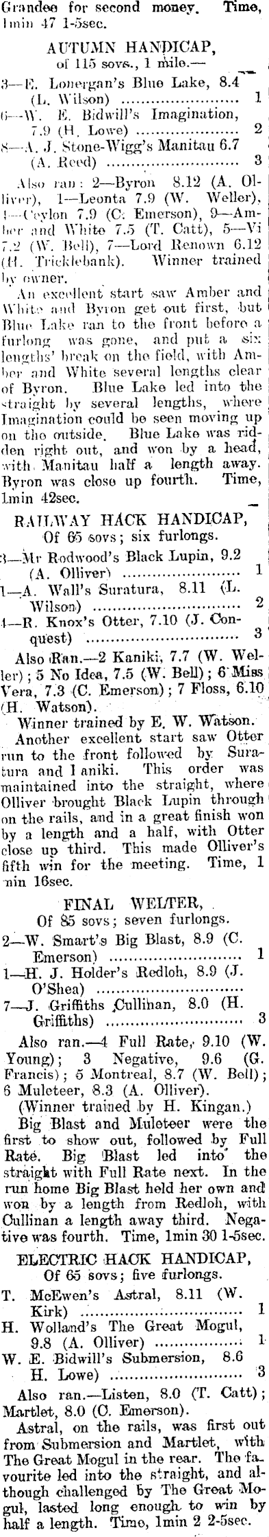 Grandee for second money. Time, I inin 47 l-ssec. AUTUMN HANDICAP, of 115 sovs., 1 mile.— 3 — E. Lonergan's Bine Lake, 8.4 (L. Wilson) 1 (i —\Y. E. Bidwill'a Imagination, 7.9 (H. Lowe) 2 S—A. J. Stone-Wigg's Manitau 6.7 (A. Heed) 3 Also ran: 2—Byron 8.12 (A. 01Hvit), I—Leonta 7.9 (W. Weller), I Cevlon 7.9 (C: Emerson), 9—Aml.<>r and White 7.5 (T. Catt), s—Vi 7.2 (W. Bell), 7—Lord Renown 6.12 (11. Tricklebank). Winner trained by owner. An excellent start 'saw Amber and Wliite and Byron get out first, but Blue Lake ran to the front before a furlong was gone, and put a six lengths' break on the field, with Amber and White several lengths clear of Byron. Blue Lake led into the straight by several lengths, where Imagination could be seen moving up on tho outside. Bine Lake was ridden right out, and won by a head, with. Manitau half a length away. Byron was close up fourth.. Time, lmin 42sec. _ RAILWAY HACK HANDICAP, Of 65 sovs; six furlongs. 3—Mr Rodwood's Black Lupin, 9.2 (A. 1 I_A. Wall's Suratura, 8.11 <L. ' Wilson) 2 I—R. Knox's Otter, 7.10 (J. Conquest) • 3 Also Ran.—2 Kaniki, 7.7 (W. Weller) ;5 No Idea, 7.5 (W: Bell); 6Miss Vera, 7.3 (C. Emerson); 7 Floss, 6.10 (H. Watson). Winner trained by E. W. Watson. Another excellent start saw Otter run to the front followed by Suratura and 1 aniki. This order was maintained into the straight, where Olliver brought Black Lupin through on the rails, and in a great finish won by a length and a half, with Otter close up third. This made Olliver's fifth win for the meeting. Time, 1 min 16see. FINAL WELTER, Of 85 sovs; seven furlongs. 2—W. Smart's Big Blast, 8.9 (C. Emerson) 1 J. Holder's Redloh, 8.9 (J. O'Shea) 7—J. .Griffiths jOullihan, 8.0 (H. Griffiths) 3 Also ran.—4 Full Rate,. 9.10 (W. Young); 3 Negative, 9.6 (G. Francis); 6 Montreal, 8.7 (W. Bell); 6 Muleteer, 8.3 (A. Olliver). (Winner trained by H. Kingan.) Big Blast and Muleteer were the first to show out, followed by Full Rate. Big Blast led into' the straigkt with Full Rate next. In the run home Big Blast held her own and won by a length from Redloh, with Oullinan a length away third. Negative was fourth. Time, lmin 30 l-ssec. ELECTRIC HACK HANDICAP, Of 65 sovs; five furlongs. T. MoEwen's Astral, 8.11 (W. Kirk) ..' ; 1 H. Wolland's The Great Mogul, 9.8 (A. Olliver) ; 1 W. E. BidwilPs Submersion, 8.6 H. Lowe) 3 Also ran.—Listen, 8.0 (T. Catt); Martlet, 8.0 (O. Eonerson). Astral, on the rails, was first out from Submersion and Martlet, with The Great Mogul in the rear. The favourite led into the straight, and although challenged by The Great Mogul, lasted long enough, to win by half a length. Time, lmin 2 2-ssec.