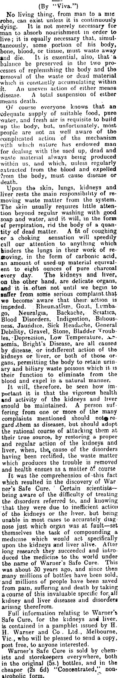 (By "Viva.") No living thing, from man to a mic robe, can exist unless it is continuously dying. It is not merely necessary for man to absorb nourishment in order to live; it is equally necessary that, simultaneously, some portion of his body, bone, blood, or tissue, must waste away and die. It is essential, also, that a balance be preserved in the two processes of replenishing the body and tho jenioval of the waste or dead material which is constantly accumulating within it. An uneven action of either means disease. A total suspension of either means death. Of course everyone knows that an odeqnnte supply of snitahle food, pure water, and fresh air is requisite to build up the body, but, unfortunately, most people are 'not as well aware of the complicated action of the mechanism with which nature has endowed man for dealing with the used up, dead and waste material always being produced within us, and which, unless regularly extracted from the blood and expelled from the body, must cause disease or death. Upon the skin, lungs, kidneys and liver rests the main responsibility of removing waste matter from the system. The skin usually requires little attention beyond regular washing with good soap and water, and it will, in the form of perspiration, rid the body of a quantity of dead matter. A fit of coughing or a choking sensation will speedily call our attention to anything which binders the lungs in their work of removing, in the form of carbonic acid, an amount of used-up material equivalent to eight ounces of pure charcoal •very day. The kidneys and liver, on the other hand, are delicate organs, and it is. often not until we begin to suffer from sotrie serious complaint.that we become'aware that their adtion is impeded. Rheumatism, Gout, Li-mba. go, Neuralgia, Backache, Sciatica, Blood Disorders, Indigestion, Biliousness, Jaundice, Sick Headache, General Debility, Gravel, Stone, Bladder les, -Depression, Low Temperature, Anaemia, Bright's Disease, are all caused by disease, or indifferent action of the kidneys or liver, or both of those organs, permitting the body to retain urinary and biliary waste poisons which it is their function to eliminate from the blood and expel in a natural manner. It will, therefore, be seen how important it is that the vigorous health and activity of the kidneys and liver snould be maintained. A person suffering from one or more of the many complaints mentioned should not® regard .them as diseases, but should adopt the rational course of attacking them at their true source, by restoring a proper and regular action of the kidneys and liver, when, the, cause of the disorders having been rectified, the waste matter which produces the trouble is removed and health ensues as a matter fif course It was the comprehension of-this fact which resulted in the discovery of War ner's Safe Cure. ' Certain scientistsbeing aware of the difficulty of treating the disorders referred to, and knowing that they were due to inefficient action of the kidneys or the liver, but being unable in most cases to accurately diagnose just which organ was at fault—set themselves the task of compounding a medicine which would act specifically upon the kidneys and liver alive. After long research they succeeded and introduced the medicine to the world under the name of Warner's Safe Cure. This was about 30 years ago, and since then many millions of bottles have been sold, 'and millions of people have been saved from pain, suffering and death by taking a course of this invaluable specific kidney and liver diseases and disorders arising therefrom. Full information relating to Warner's, Safe Cure, for the kidneys and liver, is contained in a pamphlet issued by H. H. Warner and Co . Ltd., Melbourne, Vic., who will be pleased to send a copy, post free, to anyone interested. Warner's Safe Cure is sold by chemists and storekeepers everywhere, both in the original (55.) bottles, and in the cheaper (2s 6d) "Concentrated," nonalcoholic form.