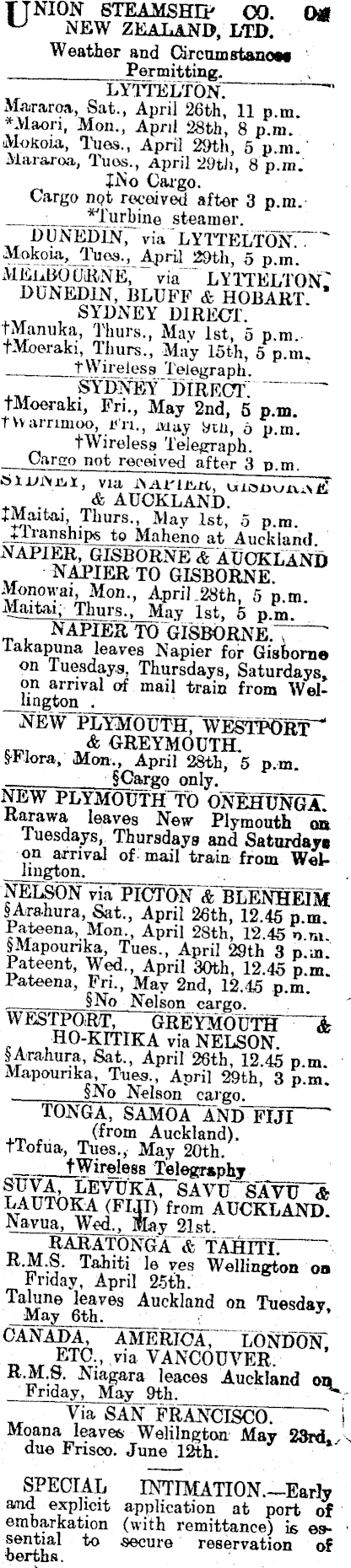 TTNION STEAMSHIP 00. Off NEW ZEALAND, LTD. Weather and CJrcnmstanoM Permitting. lyttelton: l ~^ Mararoa, Sat., April 26th, 11 p.m •Maori, Mon., April 28th, 8 p.m. Mokoia, Tues., April 29th, 5 p.m. Mararoa, Tuos., April 29th, 8 p.m. JNo Cargo. Cargo not received after 3 p.m. steamer. DUNEDIN, viaLYITELTON~ Mokoia,_Tues., April 29th, 5 p.m. M SV4^'^ E ' via lyttelton: DbNEDIN, BLUFF & HOBART. SYDNEY DIRECT. tManuka, Thurs., Mav Ist, 5 p.m.. tMoeraki, Thurs., May 15th, 5 p.m. tWireless Telegraph. SYDNEY" DIRECT: tMoeraki, Fri., May 2nd, 5 p.m. TVvarrimoo, i<n., mhj ym, b p.m. tWireless Telegraph. Cargo not received after 3 n m JSX&I, via i\Ai.-iim, \jtia . & AUCKLAND. iMaitai, Thurs., May Ist, 5 p.m. at Auckland NAPIER, GICTOBNE4 AUOKLANB NAPIER TO GESBORNE. Monowai, Mon., April.2Bth, 5 p.m. Mattai; Thurs. I _Mav Ist, 5 p.m NAPIER TO GiSBORNET^^ lakapuna leaves Napier for Gisborae on Tuesdays, Thursdays, Saturdays, on arrival of mail train from Wel_Jington _. NEW PLYMOUTHTWEgTr^r- „& GREYMOUTH. §-Flora, Mon., April 28th, 5 p.m. . §Cargo_only. NEW PLYMOUTH TO ONEHUNGA Karawa leaves New Plymouth oq Tuesdays, Thursdays and Saturday on arrival of mail train from WeW _ 'NELSON via PICTWTBLENHeTM §Arahura, Sat., April 26th, 1? ** « - , Mon., April 28th, 15 ika, Tues., April ! WESTPORT, GREYMOUTHr~^ HO-KFTIKA via NELSON. §Arahura, Sat., April 26th, 12.45 p.m. TONGA, SAMOA AND FIJI ~ ~ (from Auckland). tTofua, Tues., May 20th. tWirejesa Telegraphy ?a)t^^ vuka ' SAVU SAVU & LAUTOKA (FIJI) from AUCKLAND. Navua, Wed., May 21st. T, »,IH^ T^A &'"fAJEQTT R.M.S. Tahiti le ves Wellington on Friday, April 25th. Talune leaves Auckland on Tuesday. May 6th. ■ AMfttUVA, LON n „ EK>., Tia VANCOUVER. R.M.S. Niagara leaces Auckland on _Fj^y J _May_ 9th. ■ H *.- Via SAN FRANCISCOT s j Moana leaves; Wellington May 23rd, a due Frisco. June 12th. SPECIAL INTIMATION.-Eariy and explicit application at port of embarkation (with remittance) is essential to secure reservation of berths.