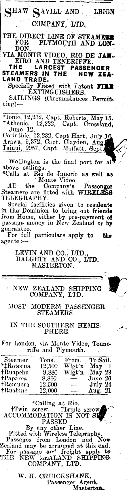 gHAW gAVILL AND LBION .■■'"' COMPANY, LTD, TEE DIRECT LINE OF STEAMEBI FOR PLYMOUTH AND LOWDON. VIA MONTE VTDEO, 810 DE JAJf. EIRO AND TENERIFFE. THE LARGEST PASSENGER STEAMERS IN THE NEW ZEALAND TRADE. Specially Fitted with Patent FIH EXTINGUISHERS. SAILINGS (Circumstances Permitting)— *lomc, 12,232, Capt. Roberts, May 15. *Athenic, 12,232, Capt. Cros6iand, June 12. Corinthic. 12,232, Capt Hart, July i& Arawa, 9,372, Capt. Clayden, Aug| Tainui, 9957, Capt. Moffatt, Sept.MK^ Wellington is the final port for al* ■ above sailings. ~ *Calls at Rio de Ja.nerio as well as Monte Video. All the Company's Passenger Steamers are fitted with WIRELESS TELEGRAPHY. Special facilities given to residents in the Dominion to bring out friends from Home, either by pre-payment of passage money in New Zealand or by guarantee. For full particulars apply to the agents:— LEVIN AND 00, LTD., DALGETY AND.OO., LTD. MASTERTON. / NEW ZEALAND SHIPPING i COMPANY, LTD. MOST MODERNS PASSENGER STEAMERS IN THE SOUTHERN HEMISPHERE. For London, via Monte Video, Tenneriffe and Plymouth. Steamer *+Rotorua tituapehu tPaparoa tßemuera tßuahine Tons. From. To Sail. 12,500 Wlgt'n May 1 9,880 Wlgt'n May 29 8,860 June 26 12,500 July 24 *Calling at Rio. •fTwin screw. JTriple screw, ACCOMMODATION IS NOT SI PASSED By any other Line. Fitted with Wireless Telegraphy. Paseages from London and JSTewr Zealand may be arranged at this end. For passage a*" 3 freight apply to THE NEW irjfiiALAND SHIPPING COMPANY, LTD. W. H. CRUICKSHANK, Passenger Agent, Mastertoiu