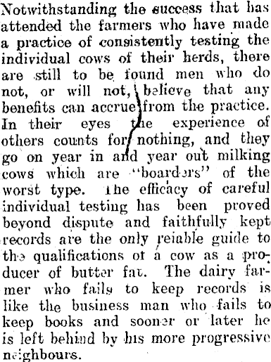 Notwithstanding the success that has attended the farmers who have made a practice of consistently testing the individual cows of their herds, there are still to be. found men who do not, or will not, l believe that any benefits can accruelfrom the practice. In their eyes tie experience of others counts for/nothing, and they go on year in and year out milking cows which are "boardjrs" of the worst type, ihe efficacy of careful individual testing has been proved beyond dispute and faithfully kept records are the only reiable guide to th 3 qualifications ot a cow as a pro-; ducer of butter fat. The dairy farmer who fails to keep records is like the business man who fails to keep books and soon-ar or later ho is left behind by his more progressive neighbours.