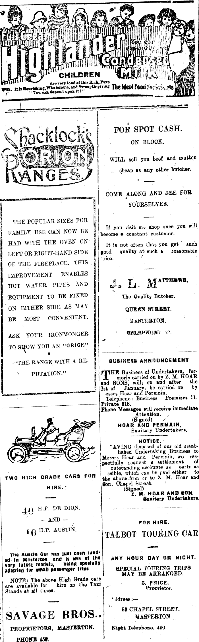 MrMM wmm llllllHiiML II iV-^fynf >» CHILDREN ' Am very fond «rftld»Bi<A,Fw» Yem oaa 4»pe«d upo» it I " , HwWkißg.tnwJwwoM, »»* The Mea! Fteri: or j MiMmmm i\nmsj FOR SPOT CASH. ON BLOCK, _ cheap as any other butcher. OOME ALONG AND SEE FOB « YOURSELVES. THE POPULAR SIZES FOR FAMILY USE CAN NOW BE HAD WITH THE OVEN ON LEFT OR RIGHT-HAND SIDE OF THE FIREPLACE. THIS IMPROVEMENT ENABLES HOT WATER PIPES AND EQUIPMENT TO BE FIXED ON EITHER SIDE AS MAY BE MOST CONVENIENT. ASK YOUR IRONMONGER TO SHOW YOU AN "ORION" —"THE RANGE WITH A RE- \ PUTATION." If you vi6it mv shop once you will become a constant customer. It is not often that you get ' such good quality a 4* such a reasonable ATTH»WB B The Quality Butcher. QUUEN STREET. iSAWTKETOM. fIWiKPHUIO fX BUSINESS ANNOUNCEMENT HE Businesfl of Undertakers, forJL merly carried on by Z. M. HOAR and SONS, will* on and after the Hat of January, be carried on by • essrs Hoar and Permain. Telephone: Businoaß Premises 11. Private 818. Phone Messages will receive immediate Attention. / TWO HICH CRADE CARS FOR 4 t i H.P. DE DION. -. AND - / t i\ H.P. AUSTIN. HOAR AND PERMAIN, Sanitary Undertaker!. NOTICE. ""AVING disposed of our old ©stablished Undertaking Bußimesß to Messrs Hoar and Permain, we respectfully requeut a settlement oi I outstanding accounts as early as I ssible, whioh can be paid either to Ithe above firm ar to Z. M. Hoar and Son, Chapel Street. (Signed) t. M. HOAR AND SON, Baaitary Undertakers. t*GR HIRE. TALBOT TOURING CAR The Austin-Car hat just Been !■«*" ad In Masterton end Is SB* •ftM vary latest models, being specially adapted for small passenger trips NOTE: The above High Grade cara are available for hire on the Taxi Standa at all times. SAVAGE BROS.. PROPRIETORS, MAfITERTQN. PHONS 46f. ANY HOUR DAY OR NIGHT. SPECIAL TOURING TRIPS MAY BE ARRANGED. 8. fRICE, Prowrietor. * ddreaa :- 98 CHAPEL STREET. MASTERTON Night Telephone, 490.