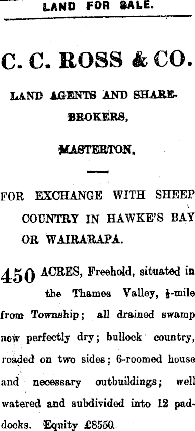 LAND FOR SALE. C. C. ROSS & CO. LAND AGENTS AND SHAREBROKERS, 9CABTERTON. FOR EXCHANGE WITH SHEEP COUNTRY IN HAWKE'S BAY OR WAHURAPA. AKQ ACRES, Freehold, situated in the Thames Valley, J-mile from Township; all drained swamp nofr perfectly dry; bullock country, roaded on two sides; 6-roomed house and necessary outbuildings; well watered and subdivided into 12 paddocks. Equity £8550..