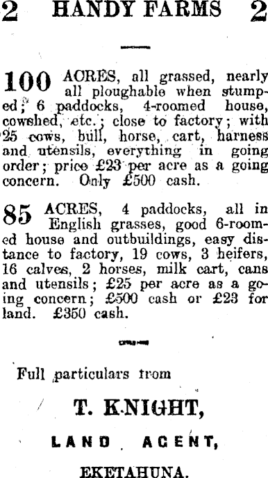 HANDY FARMS "» A A ACRES, all grassed, nearly *z" all ploughable when stumped f 6 paddocks, broomed house, cowshed, etc.'i close to factory; with !< iR jvrtia hi'tu hnraa cart. nnVTiAftß and. utensils, everything m going order; price £23 per acre as a going concern. Only £SOO cash. QK ACRES, 4 paddocks, all in English grasses, good 6-room-ed house and outbuildings, easy distance to factory, 19 cows, 3 heifers, 16 calves, 2 horses, milk cart, cans and utensils; £25 per acre as a going concern; £SOO cash or £23 for land. £360 cash. Full particulars irom T. KNIGHT, LAND. AGENT, EKETAHUNA.
