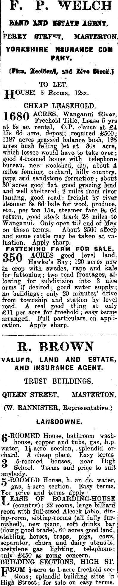 F. P. WELCH AUR> AMD WKAm AGWT, PEKRT MASTERTON. YORKSHIRE NtURAHCE COM fkHY. (Fto», XeriHenf, affid Harm WtotSi.) TO let! JJOUSE; 5 Booms, 12ss. CHEAP LEASEHOLD. 1 AQA ACRES, Wanganui Stiver,. luou Freehold Title, Lease 5 yrs at 5s ao. rental, C.P. clause at £4 17s 6d acre, deposit required £500; 1187 acres grassed balance bush, 125 acres bush felling let at 30s acre, which lessee would have to take over; good 4-roomed house with telephone bureau, new woolshed, dip, about 4 miles fencing, orchard, hilly country, papa amd sandstone formation; about 30 acres good flat, good grazing land and well sheltered: 2 miles from river landing, good road; freight by river steamer 8s 6d bale for wool, produce, etc., per ton 15s, steamer fare 9s 6d return, good stock track 28 miles to Wanganui. Only open till end of May on these terms. About 26XK) sffee'p and some cattle may be taken at valuation. Apply sharp. FATTENING FARM FOR SALE. ' W V Hawke's Bay; 120 acres now in crop with swedes, rape and kale for fattening; two road frontages, allowing for subdivision into 3 nice arms if desired; good water supply;, no buildings; only 20 minutes' drive from township and station by level road. A real good thing at only £ll per acre for freehold; easy term* arranged. Full particulars, on appli-i cation. Apply sharp. R. BROWN VALUFR, LAND AND ESTATE, AND INSURANCE AGENT. TRUST BUILDINGS, QUEEN STREET, MASTERTON. (W. BANNISTER, Representative.) LANSDOWNE. {•-ROOMED House, bathroom wash- ** house, copper and tubs, gas, h.p. water, IJ-acre section, , splendid orchard. A cheap place. Easy terms O 5-roomed houses, near High ** School. Terms and price to suit K -ROOMED House, h. an dc. water, gas, J-acre Easy terms. For price and terms apply ' J EASE OF BOARDING-HOUSE (country); 22 rooms, large billiard room with full-sized Alcock table, din-ing-room, sitting-Tooms (all fully furnished),, new piano, soft drinks bar (doing good trade), 60 acres good land, stabling, horses, traps, pigs, oows, separator, churn and dairy utensils, acetylene gas lighting, telephone; only* £450 as Roing concern. BUILDING SECTIONS, HIGH ST. tions; splendid building sites m High Street; for sale on easy terms.