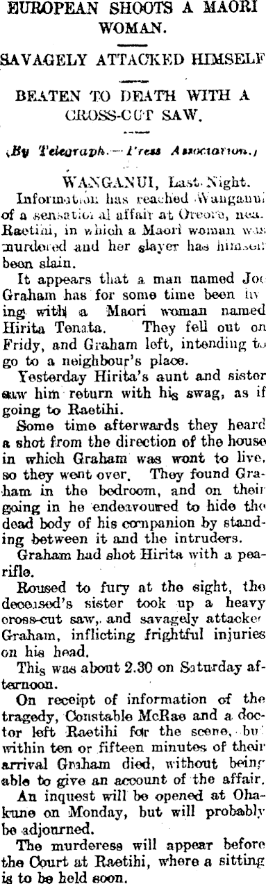 EUROPEAN SHOOTS A MAORI WOMAN. SAVAGELY ATTACKED HIMSELF BEATEN TO DEATH WITH A CROSS-CUT SAW. vjßv 'i'eleoraph.— i'rau A wort anon./ WAXGANUI, Last. Night. Information has reached .Waugauui of a #en?>&tio< al affair at Oreor'o, n<sa. Raetixii, in which a Maori woman wu. arurdored and her slayer has huxuoi: bean slain. It appears that a man named Jot Graham has for some time been Liv ing with| a Maori woman named Hirita Tena,ta. They fell out on Fridy, and Graham loft, intending to go to a neighbour's place. Yesterday Hirita's aunt and sister mm him return with his swag, as if going to Raetihi. Some time afterwards they heard a shot from the direction of the house in which Graham waa wont to live, so they went over. They found Graham in the bedroom, and on their gioing in he endeavoured to hide the dead body of his companion by standing between it and the intruders. Graham had shot Hirita with a pearifle. Roused to fury at the sight, tho deceased's sister took up a heavy oros»-cut saw,, and savagely attacked Graham, inflicting frightful injuries on his head. Thi s was about 2.30 on Saturday afternoon. On receipt of information of the tragedy, Constable Mcßae and a doctor left Raetihi fo|r the scene, be within ten or fifteen minutes of their arrival Graliam died, without beinr able to give an account of the affair. An inquest will be opened at Ohakune on Monday, but will probably be adjourned. The murderess will appear before the Court at Raetihi, where a sitting is to be held Boon.