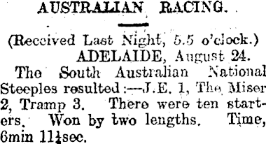 AUSTRALIAN RACING. (Received Last Night, 5.5 o'clock.) ADELAIDE, August 24. , The South Australian National Steeples resulted:—<LE. 1, The Miser 2, Tramp 3. There were ten starters. Won by two lengths. Time, 6miu llisec.