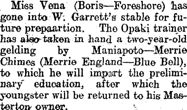 Miss Vena (Boris —Foreshore) has gone into W; Garrett's stable for future prepaartion. The Opaki trainer has also-taken in hand a two-year-old gelding by Maniapoto—Merrie Chimes (Merrie England—Blue Bell), to which he will impart the preliminary" education, after which the youngster will be returned to his Masterton' owner.