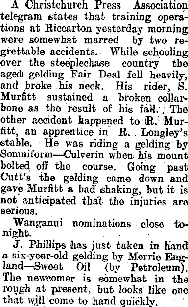 A Ohristchurch Press Association telegram states that training operations at Riccartom yesterday morning were somewhat marred by two regrettable accidents. While schooling over the steeplechase country the agedi gelding Fair Deal fell heavily, and broke his neck. His rider, S. Murfitt sustained a broken collarbone as the result of his faH. .'.The other accident happened to iR. Murfitt, an apprentice in R. . Longley's stable. He was riding a gelding by Somniform—Culverin when, his mount bolted off the course. Going past Cutt's the gelding came down and gave-Murfitt a bad shaking, but it is not anticipated that the injuries are serious. Wanganui nominations close tonight. J. Phillips has just taken in hand a six-year-old gelding by Merrie England—Sweet Oil (by Petroleum). The newcomer is somewhat in the rough at present, but looks like one that wjll come to hand quickly.