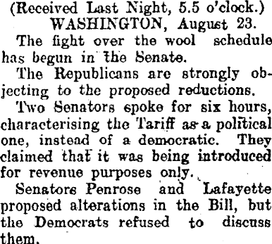 (Received Last Night, 5.5 o'clock.) WASHINGTON, August 23. The fight over the wool schedule has begun in the Senate. The Republicans are strongly objecting to the proposed reductions. Two Senators spoke for six hours, characterising the Tariff as-a political one, instead of a democratic. They claimed that* it was being introduced for revenue purposes only. L Senators Penrose and Lafayette proposed alterations in the Bill, but the Democrats refused to discuss them.
