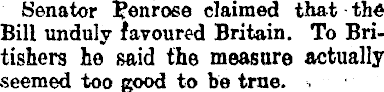 Senator "Penrose claimed that - the Bill unduly favoured Britain. To Britishers he said the measure actually seemed too good to be trne.