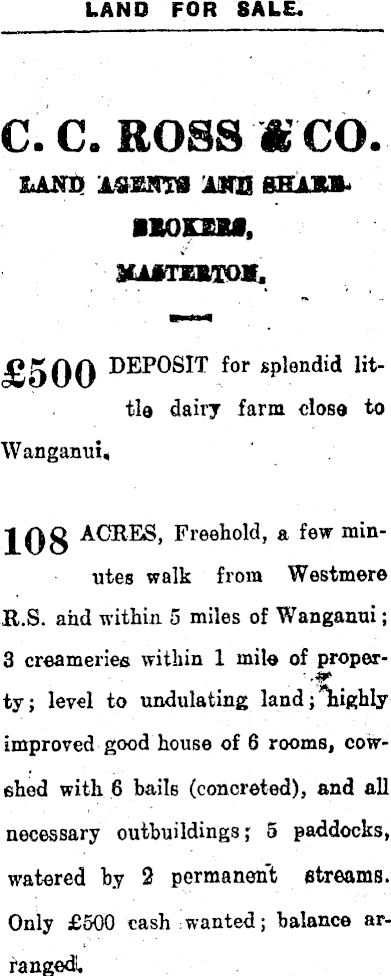 LAND FOR SALE. C.C.ROSS AGO. mm I&SOTS Him BEAJOk MOKBBt, £SOO ]DEPOSIT for *pkndid little dairy farm close to Wanganui, IAQ ACRES, Freehold, a few minutes walk from Westmere R.S. and within 5 miles of Wanganui; 3 creameries within 1 mile of property; level to undulating land; "highly improved good house of 6 rooms, cowshed with 6 bails (concreted), and all necessary outbuildings? 5 paddocks, watered by 2 permanent streams. Only £SOO cash wanted; balance arranged!.
