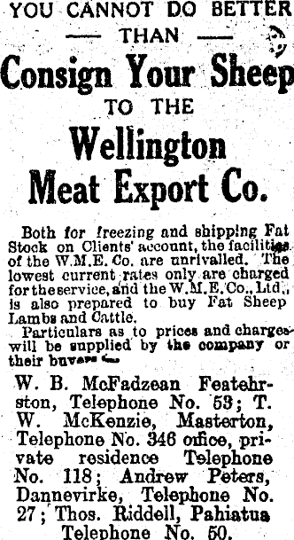 YOU CANNOT DO BETTER • THAN;,- ■=' ""*'"■'" our TO THE Both for freezing and shipping Fat Stock on Clients'account, the facility of the W.M.E.Co. are unrivalled. The, lowest current rates only are charged for the service, and the W.M.E. Co., Ltd,; is also prepared to buy Fat Sheep Lambs and Cattle. Particulars as to prices and charge** will be supplied by ihc company or their trow" *- W. B. MoFadzean Featehrston, Telephone No. '53 j T. W. McKenzie, Masterton, Telephone No. 346 oifioe, private residence Telephone No. 118; Andrew Peters, Dannevirke, Telephone No. 27;Thos. Riddell, Pahiatna Telephone No. 50.